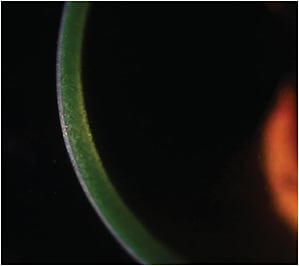 Slit-lamp photo of riboflavin loading during epi-on CXL shows good saturation.