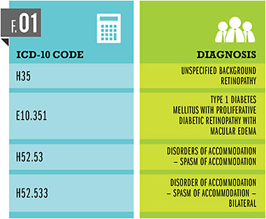 ICD-10 codes can be as few as three or as many as seven characters. The codes will always have three characters before the decimal and as many as four after. The first character is always alphabetic (but never a “U”) and the second character is always numeric; the rest of them can be either alphabetic (capitalization doesn’t matter) or numeric. In ophthalmology, most of the codes will begin with “H.” However, if it is endocrine related, such as diabetic-related cataracts or retinopathy, it will begin with an “E” for Endocrine. For an example, see Figure 1.