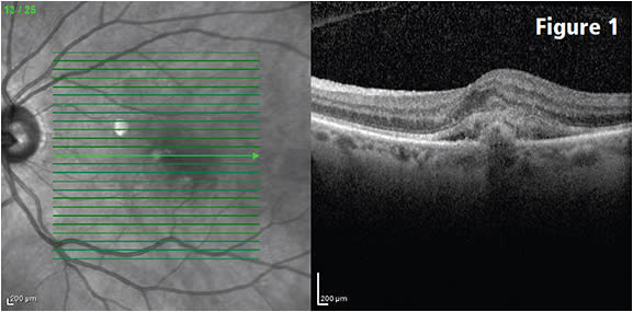 Figure 1: Baseline study shows subfoveal hyperreflectivity, consistent with subfoveal choroidal neovascularization, subfoveal fluid and mild foveal thickening. Visual acuity was 20/70. Bevacizumab (Avastin, Genentech) treatment began that day.COURTESY CHRISTOPHER HAUPERT, MD