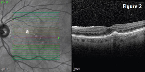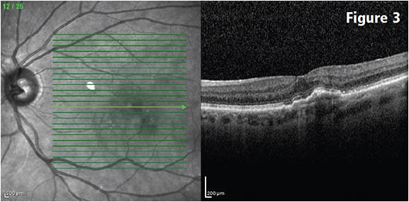 Figure 2: Three months after the baseline visits, following three monthly bevacizumab injections. Mild subfoveal elevation of the retinal pigment epithelium with resolution of all macular fluid. Visual acuity improved to 20/40. COURTESY CHRISTOPHER HAUPERT, MD