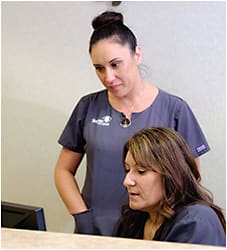 Jasmine Peterson, COA (standing) looks over patient information with Cerina Bauer, COA.