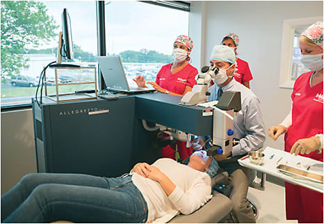 Assisting Dr. von Roemer in a demonstration of the Wavelight Allegretto laser vision correction system are (from left): Denise Waldron, COA, director, Laser Vision Team; Rebecca Kopliner, COA, clinic manager; and Debbie Couch, COA.