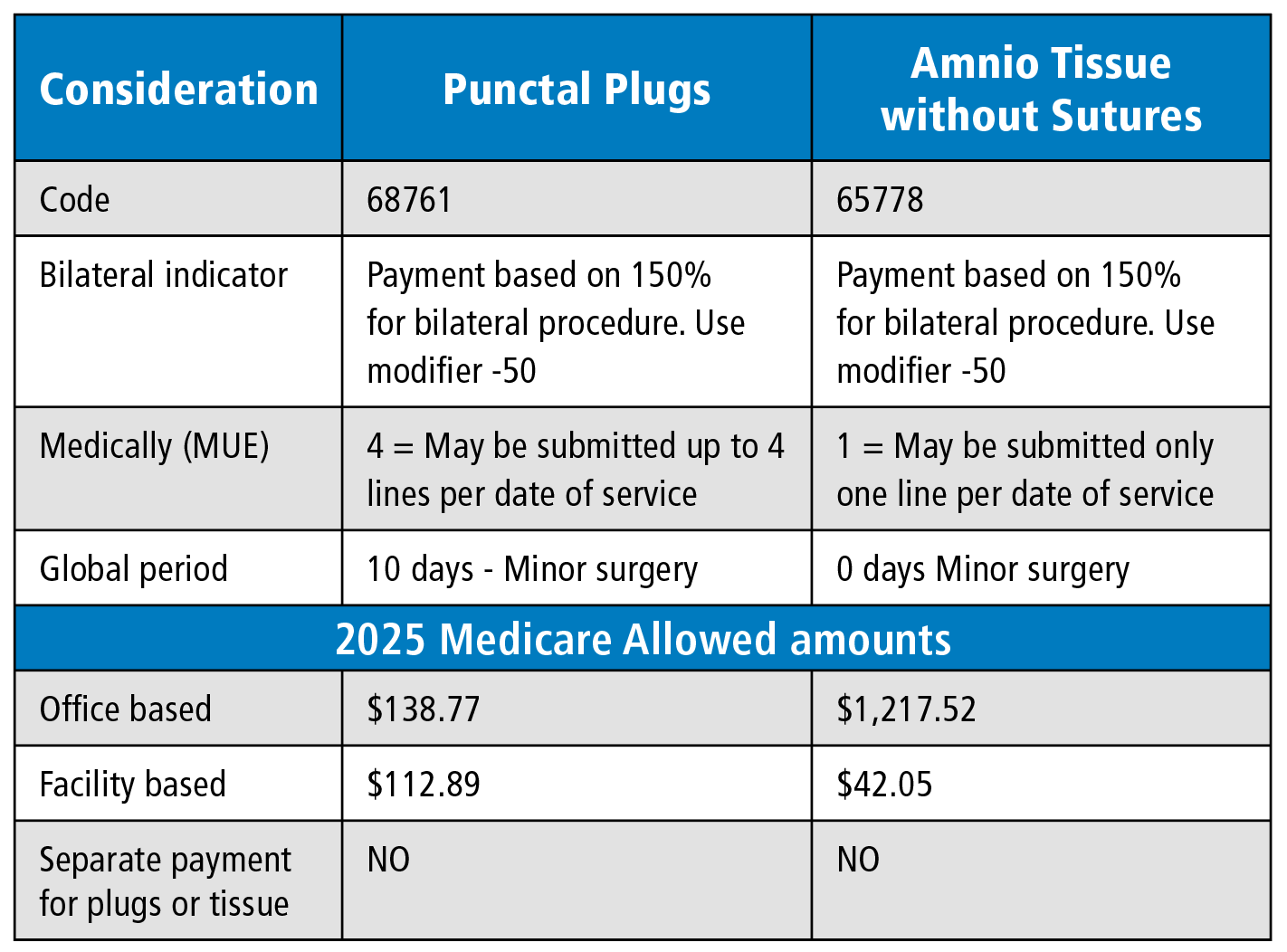 When billing for either punctal plugs or placement of amnio tissue for dry eyes, there are numerous coding considerations. Follow minor surgery billing rules related to the same day exam. A billable exam requires modifier -25.